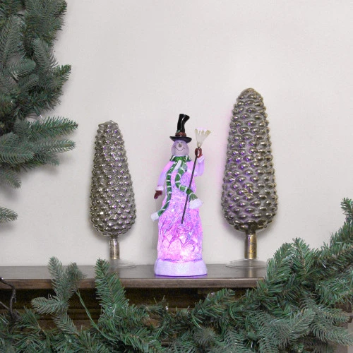 A wintry day is not complete without a snowman in some form. This charming glitter dome features a snowman decorated with iridescent glitter details complete with a top hat, mittens, and scarf holding a broom. Glitter swirls in his belly while being illuminated by a color-changing LED light.