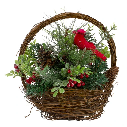 Features a vibrant red cardinal among berries, pine cones, pine sprigs and other mixed foliage