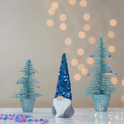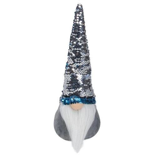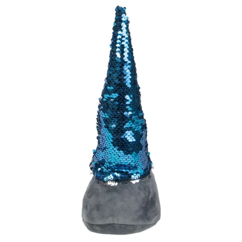 - The pointed hat is accented with blue to silver flip sequin