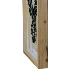 There is a figure of a deer face formed with mini nails and black yarn with large antlers in the center of the box