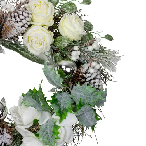 - Comes with assorted white flowers, berries, leaves, and pine cones